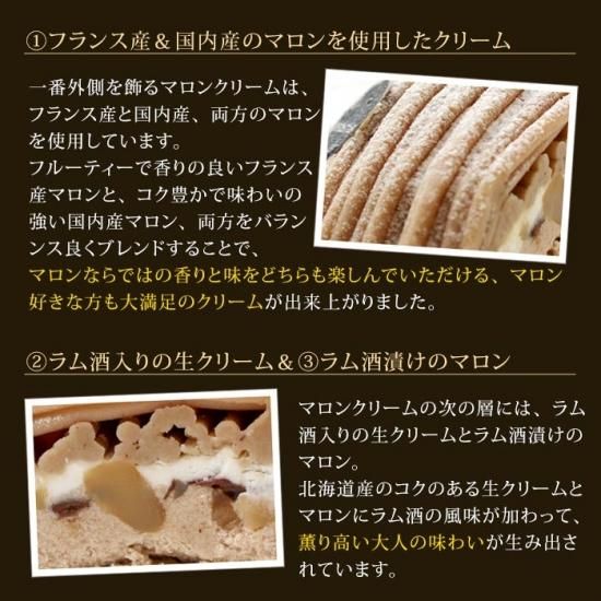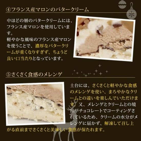 濃厚でまろやかなマロンクリームと、さくさくのメレンゲがコントラストとなって、リッチながら飽きのこない贅沢な味わいを生み出しています。楽しいクリスマスに、ぜひお召し上がりくださいませ。