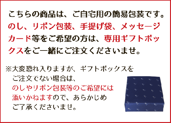 ※恐縮ながら、簡易梱包商品のため、ギフトボックスご利用の場合を除きのし・リボン包装・メッセージカード・手提げ袋はご対応不可とさせていただいております。
